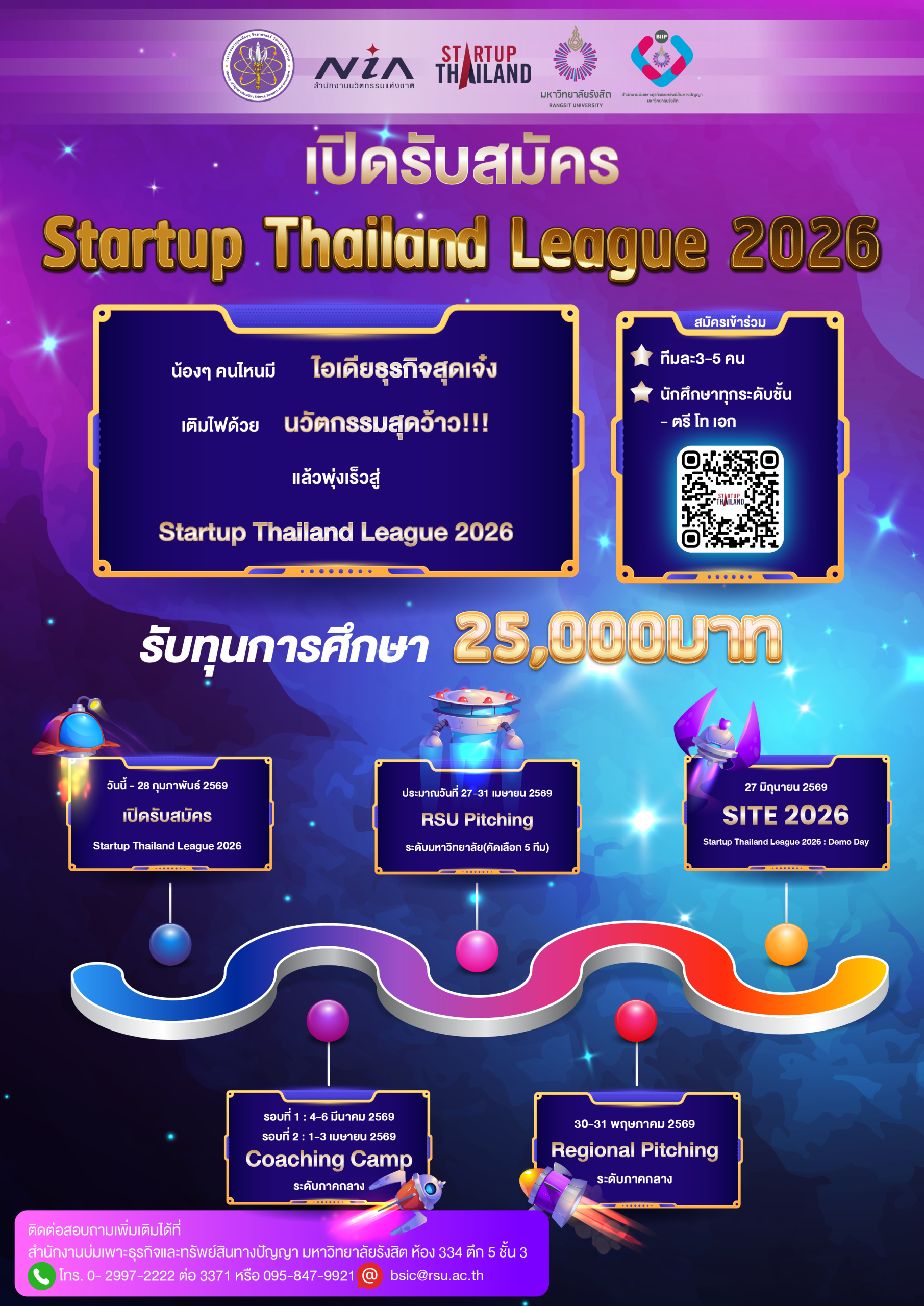 สำนักงานบ่มเพาะธุรกิจและทรัพย์สินทางปัญญา มหาวิทยาลัยรังสิต มอบทุนความสามารถพิเศษด้านสิ่งประดิษฐ์ นวัตกรรม และการเป็นผู้ประกอบการ (ทุน 50%) จำนวน 10 ทุน เปิดรับสมัครตั้งแต่บัดนี้-วันที่ 31 มี.ค. 69