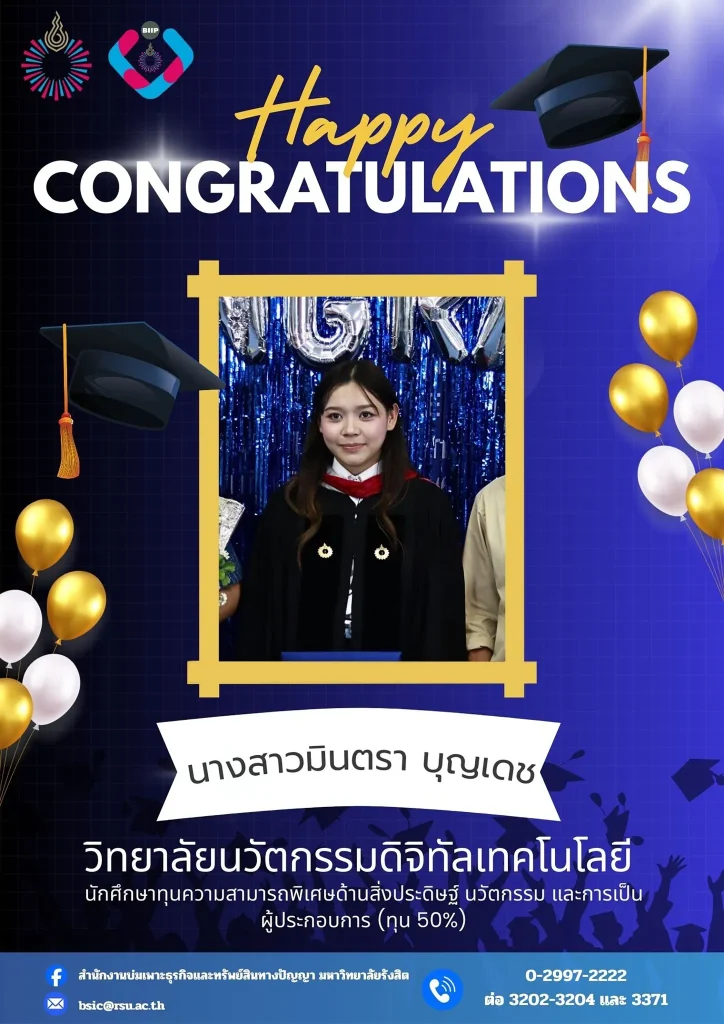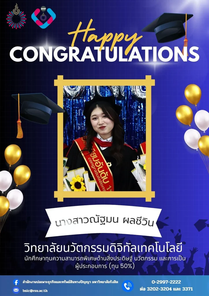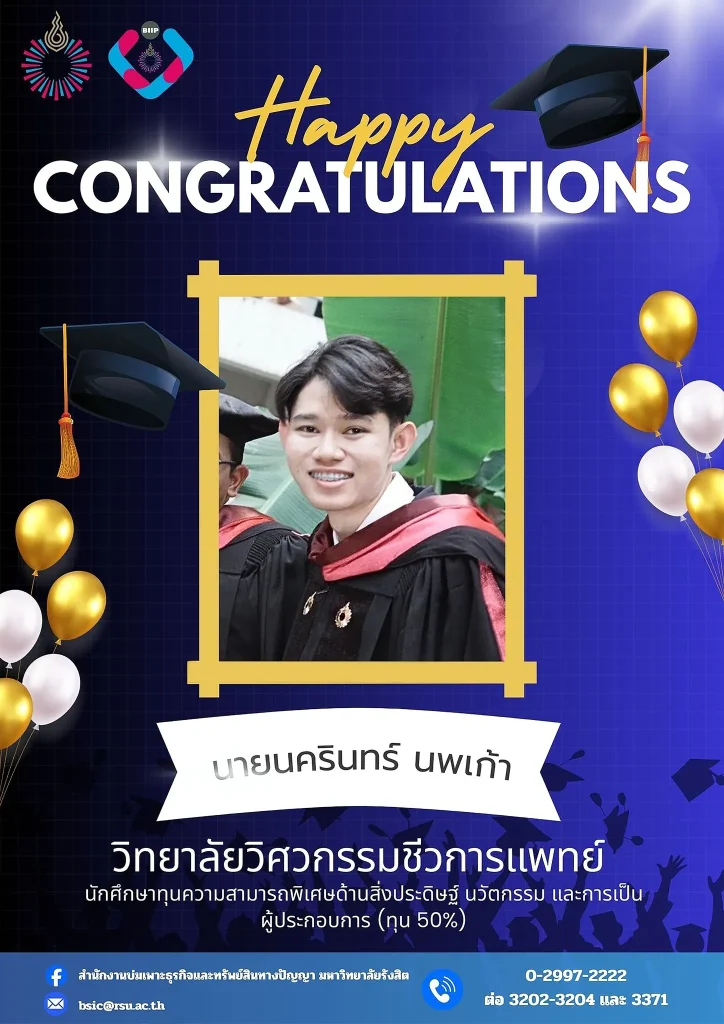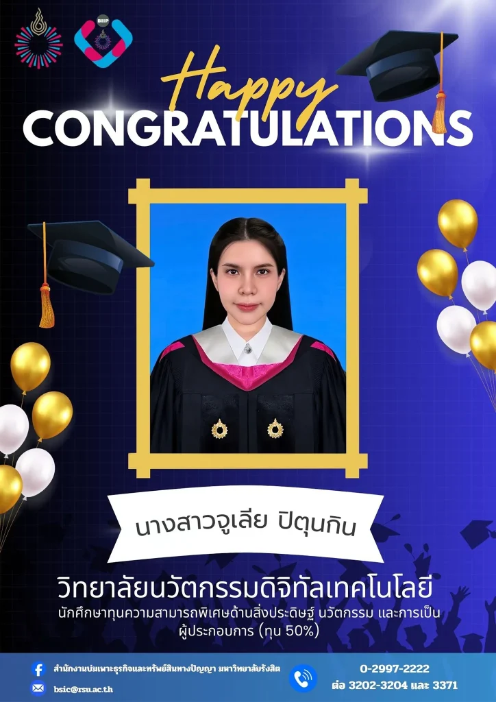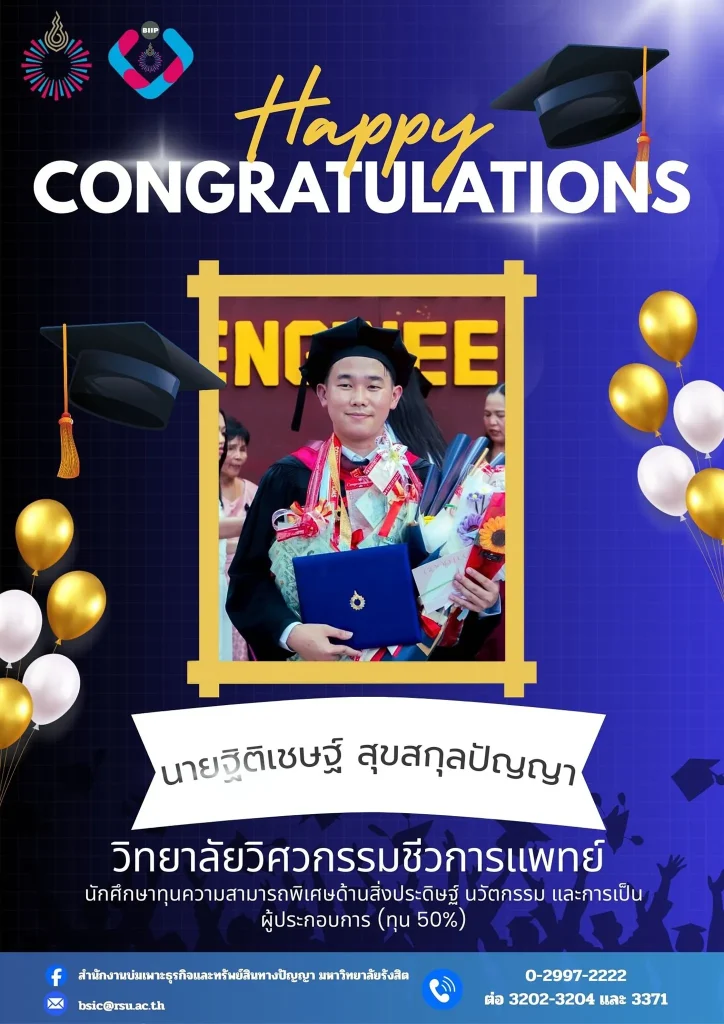 ขอแสดงความยินดีกับบัณฑิตนักศึกษาทุนความสามารถพิเศษด้านสิ่งประดิษฐ์ นวัตกรรม และการเป็นผู้ประกอบการ (ทุน 50%) เข้ารับปริญญาบัตร ประจำปี 2567By bsicrsu / 15 ธันวาคม 2025 ขอแสดงความยินดีกับบัณฑิต นักศึกษาทุนความสามารถพิเศษด้านสิ่งประดิษฐ์ นวัตกรรม และการเป็นผู้ประกอบการ (ทุน 50%)เข้ารับปริญญาบัตร ประจำปี 2567 ได้แก่1.นางสาวจูเลีย ปิตุนกิน (จูเลีย)วิทยาลัยนวัตกรรมดิจิทัลเทคโนโลยี2.นางสาวณัฐมน ผลชีวิน (ปราย)วิทยาลัยนวัตกรรมดิจิทัลเทคโนโลยี3.นางสาวมินตรา บุญเดช (มุก)วิทยาลัยนวัตกรรมดิจิทัลเทคโนโลยี4.นายภานุพงศ์ อุ่นคำ (เบส)วิทยาลัยวิศวกรรมชีวการแพทย์5.นายนครินทร์ นพเก้า (ต้า)วิทยาลัยวิศวกรรมชีวการแพทย์6.นายฐิติเชษฐ์ สุขสกุลปัญญา (เก่ง)วิทยาลัยวิศวกรรมชีวการแพทย์
